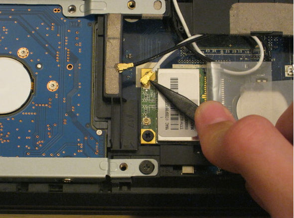 Cũng tương tự như RAM, bạn chỉ cần kéo card WLAN một góc về phía bạn và tháo card WLAN cũ ra khỏi khe cắm.