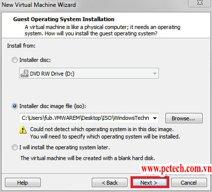Chọn Next để tiếp tục, tại cửa sổ chọn file ISO như hình dưới, các bạn dẫn đến file iso cài đặt của Windows 10(Các bạn cũng có thể bấm I will install the ….. để chèn file ISO vào sau cũng được: