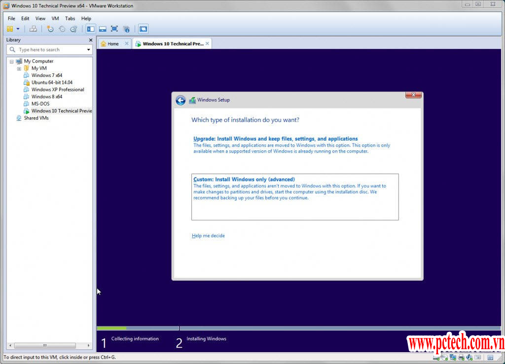 Quá trình cài đặt của Windows 10 có thể nói là giống với Windows 8. Sau khi chấp nhận Windows 10 Tech Preview, bạn có thể chọn để cài đặt các hệ điều hành với Custom: Install Windows only (advanced).