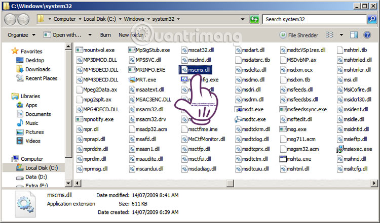Trước hết bạn truy cập theo đường dẫn sau: C:\Windows\system32\ và chọn file có tên là mscms.dll.