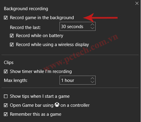 Nhấn tổ hợp phím Windows + G để kích hoạt Game Bar, sau đó nhấn vào nút Settingsđể mở menu cài đặt. Sau đó tích vào tuỳ chọn Record game in the background dưới mục Background recording. Ngoài ra, mục Record the last cho phép bạn thay đổi thời gian ghi âm.