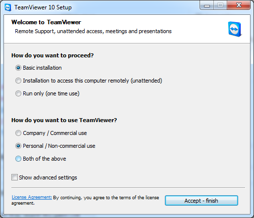 Bước 2 . Cửa sổ hiện thị một số các tùy chọn thông thường thì máy tính cá nhân bạn nên để mặc định chế độ Basic installation và Personal / non-Commerical Use và nhấn chuột vào Accept – Finish phần mềm sẽ tự động cài lên.