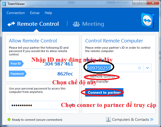 Bước 4. Để điều kiển một máy tính từ xa các bạn cần có ID của máy cần đến và mât khẩu.